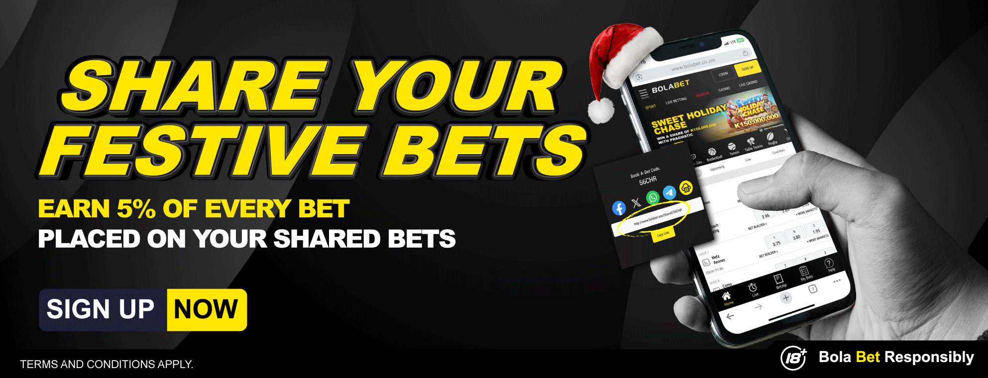 - Booking codes must be redeemed on the Bolabet Zambia platform. Bets placed on a different country’s Bolabet site or outside Zambia will not be linked to the Share Your Festive Bets system. Likewise, codes generated in Zambia cannot be used by accounts registered in other countries (and vice versa).