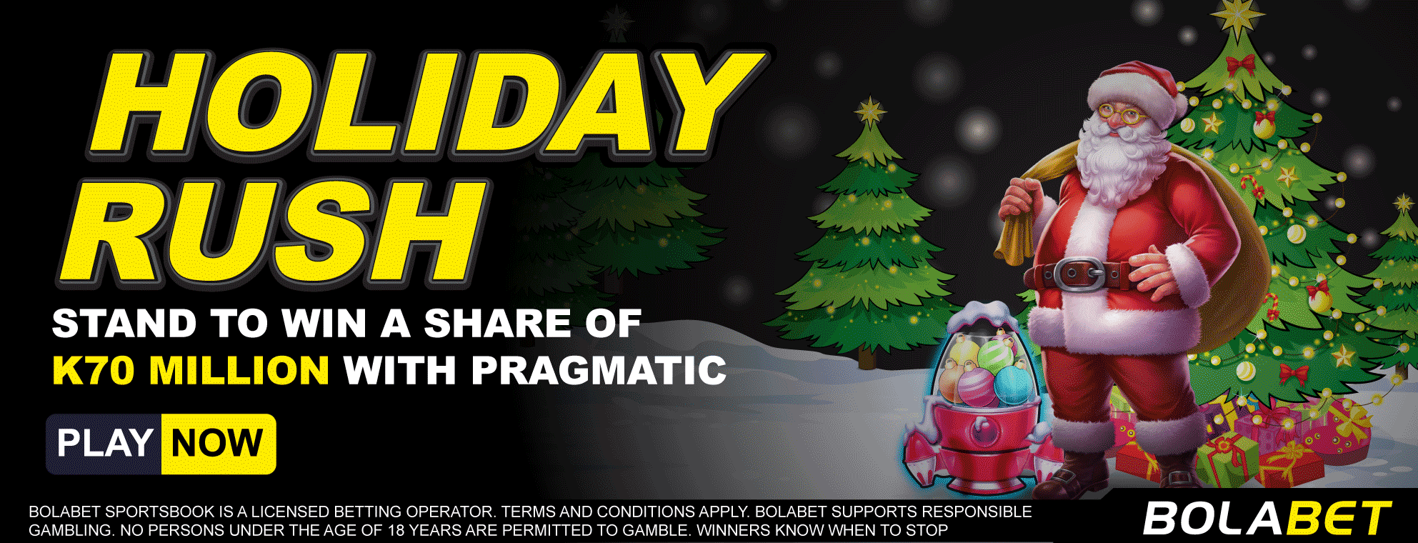 These terms and conditions govern your participation in the “Holiday Drops” promotion offered by Bolabet Company Limited (“Bolabet”) in collaboration with Pragmatic Play. By joining this promotion on the Bolabet platform, you agree to comply with these terms, Bolabet’s standard Terms and Conditions of Use, Bolabet’s General Betting Rules, and Pragmatic Play’s promotion rules. This promotion includes daily prize drops where players can win cash rewards, free spins, or instant bonuses by playing selected Pragmatic Play games on the Bolabet platform.